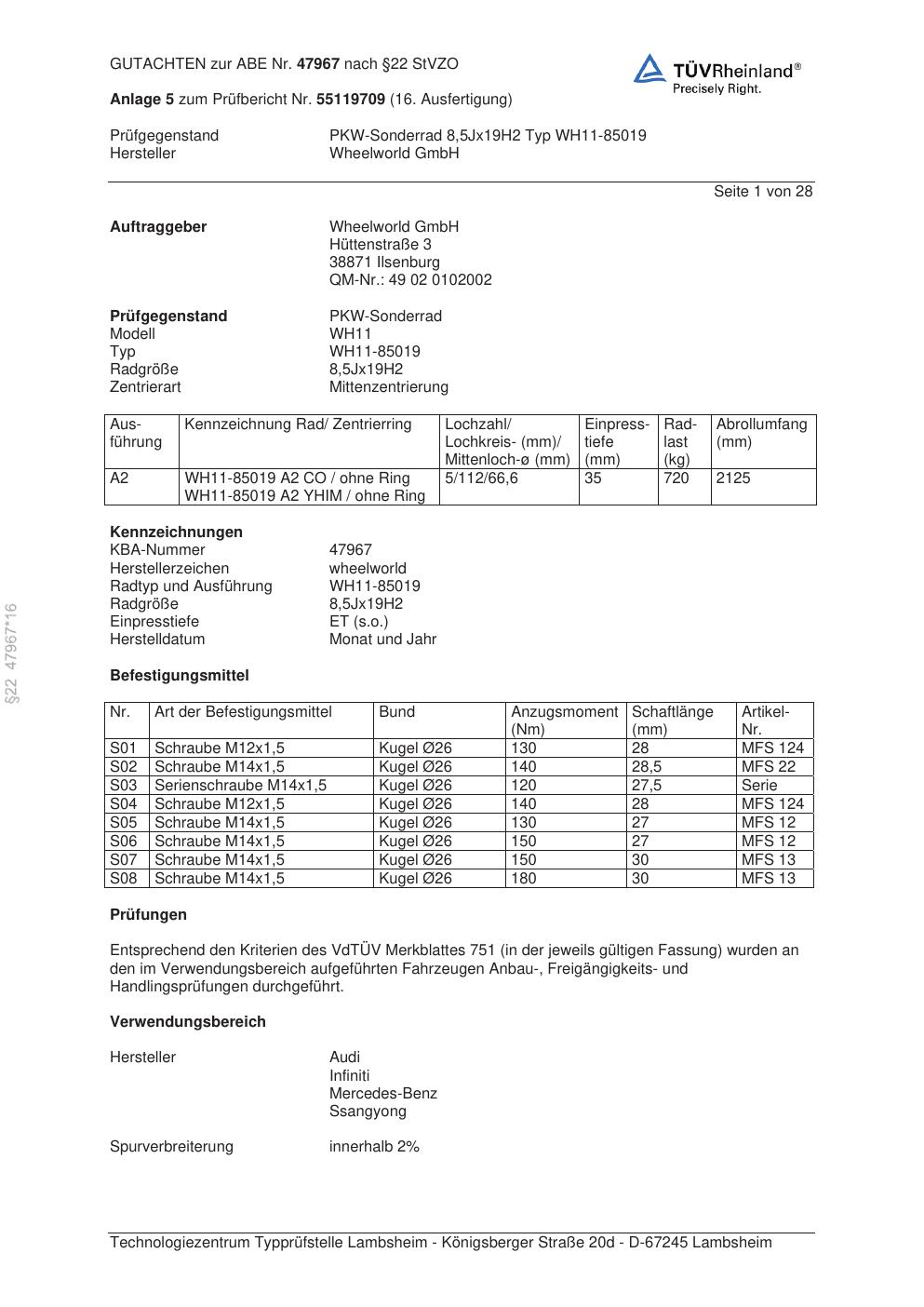 Dieses Gutachten (abe) bezieht sich auf die Alufelge Wheelworld GmbH WH11-85019 in der Ausführung ET 0, Mittenloch 0 mm (KBA 47967). Im PDF findest du typischerweise zulässige Reifengrößen, Auflagen/Anbauhinweise und – je nach Dokument – Hinweise zur Eintragung.