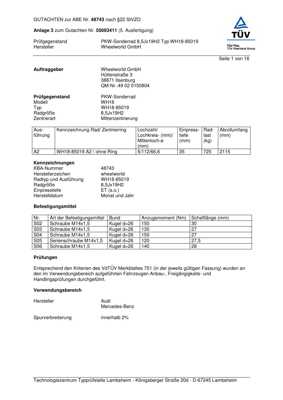 Dieses Gutachten (abe) bezieht sich auf die Alufelge Wheelworld GmbH WH18-85019 in der Ausführung ET 0, Mittenloch 0 mm (KBA 48743). Im PDF findest du typischerweise zulässige Reifengrößen, Auflagen/Anbauhinweise und – je nach Dokument – Hinweise zur Eintragung.