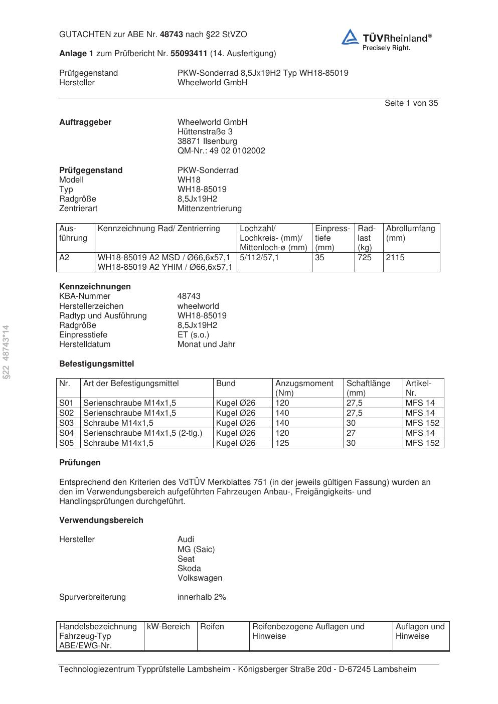 Dieses Gutachten (abe) bezieht sich auf die Alufelge Wheelworld GmbH WH18-85019 in der Ausführung ET 0, Mittenloch 0 mm (KBA 48743). Im PDF findest du typischerweise zulässige Reifengrößen, Auflagen/Anbauhinweise und – je nach Dokument – Hinweise zur Eintragung.