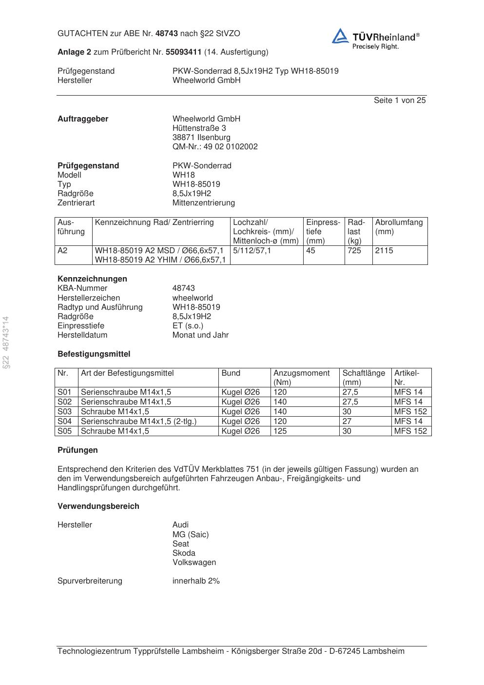 Dieses Gutachten (abe) bezieht sich auf die Alufelge Wheelworld GmbH WH18-85019 in der Ausführung ET 0, Mittenloch 0 mm (KBA 48743). Im PDF findest du typischerweise zulässige Reifengrößen, Auflagen/Anbauhinweise und – je nach Dokument – Hinweise zur Eintragung.