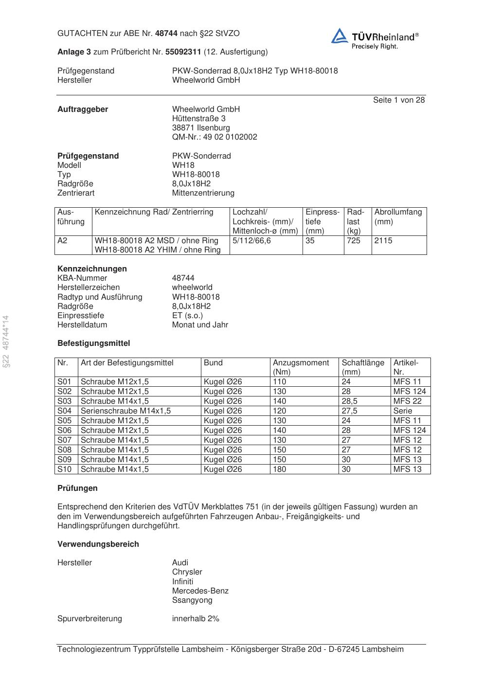Felgengutachten / abe für Alufelgen Wheelworld GmbH WH18-80018 (ET 0, Mittenloch 0 mm) mit KBA 48744 (Zertifikatsnummer 48744). Hier kostenlos als PDF herunterladen. Der Download-Link ist 24 Stunden gültig und kann bis zu zwei Mal verwendet werden.
