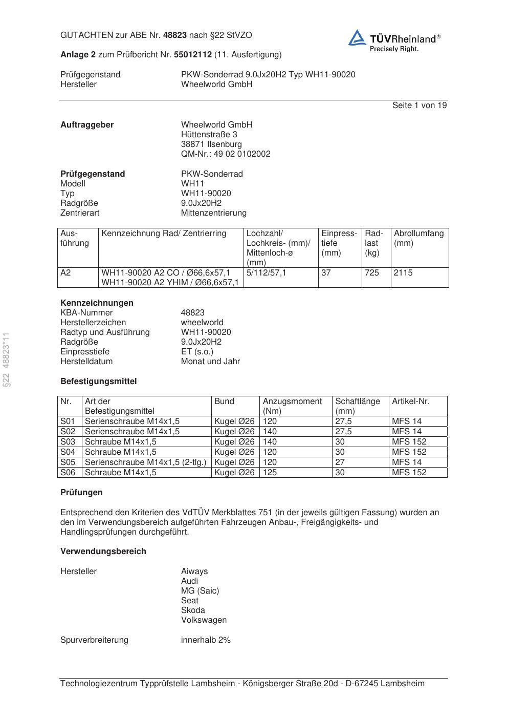 Dieses Gutachten (abe) bezieht sich auf die Alufelge Wheelworld WH11-90020 in der Ausführung ET 0, Mittenloch 0 mm (KBA 48823). Im PDF findest du typischerweise zulässige Reifengrößen, Auflagen/Anbauhinweise und – je nach Dokument – Hinweise zur Eintragung.