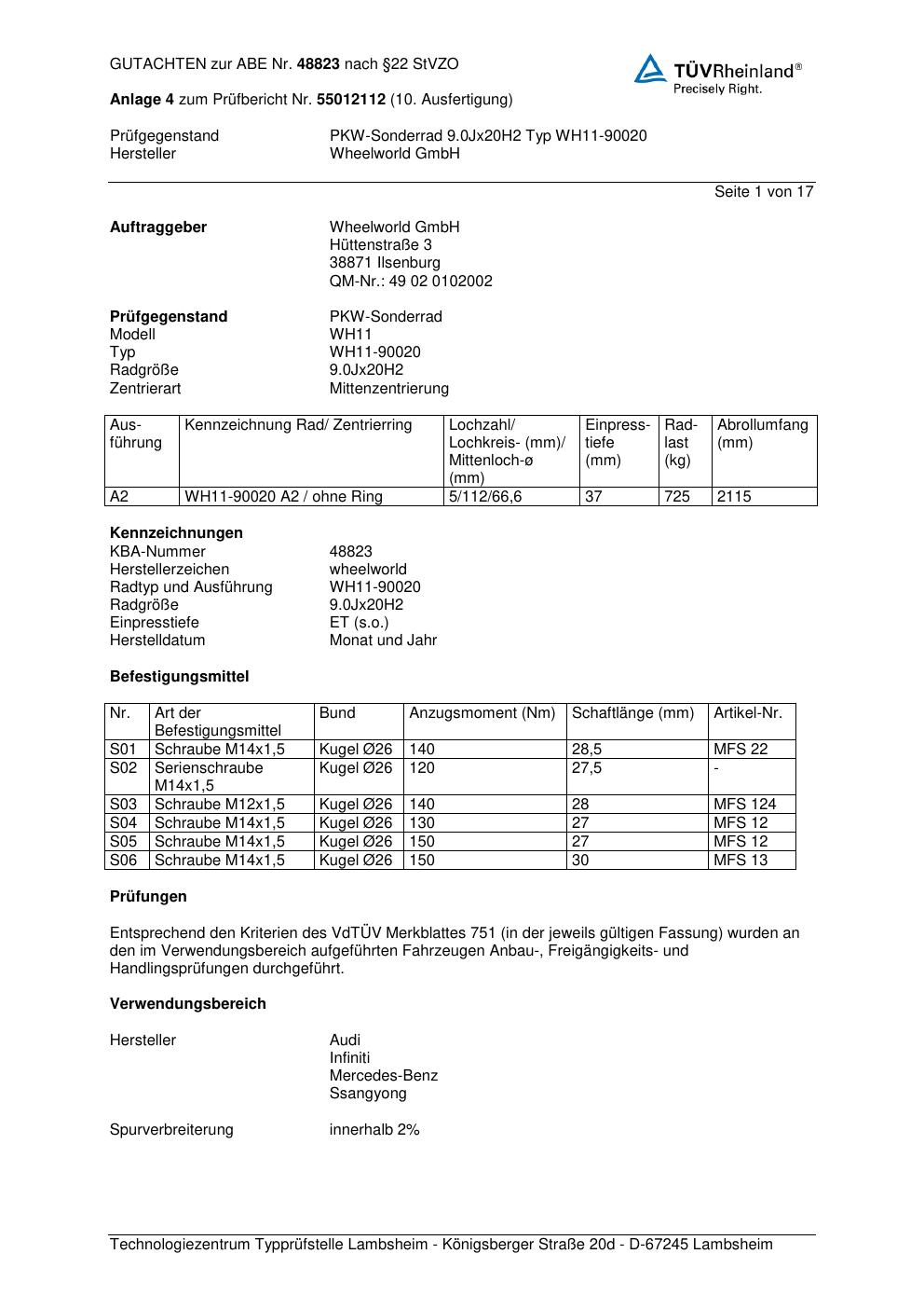 Dieses Gutachten (abe) bezieht sich auf die Alufelge Wheelworld WH11-900 20 in der Ausführung ET 0, Mittenloch 0 mm (KBA 48823). Im PDF findest du typischerweise zulässige Reifengrößen, Auflagen/Anbauhinweise und – je nach Dokument – Hinweise zur Eintragung.