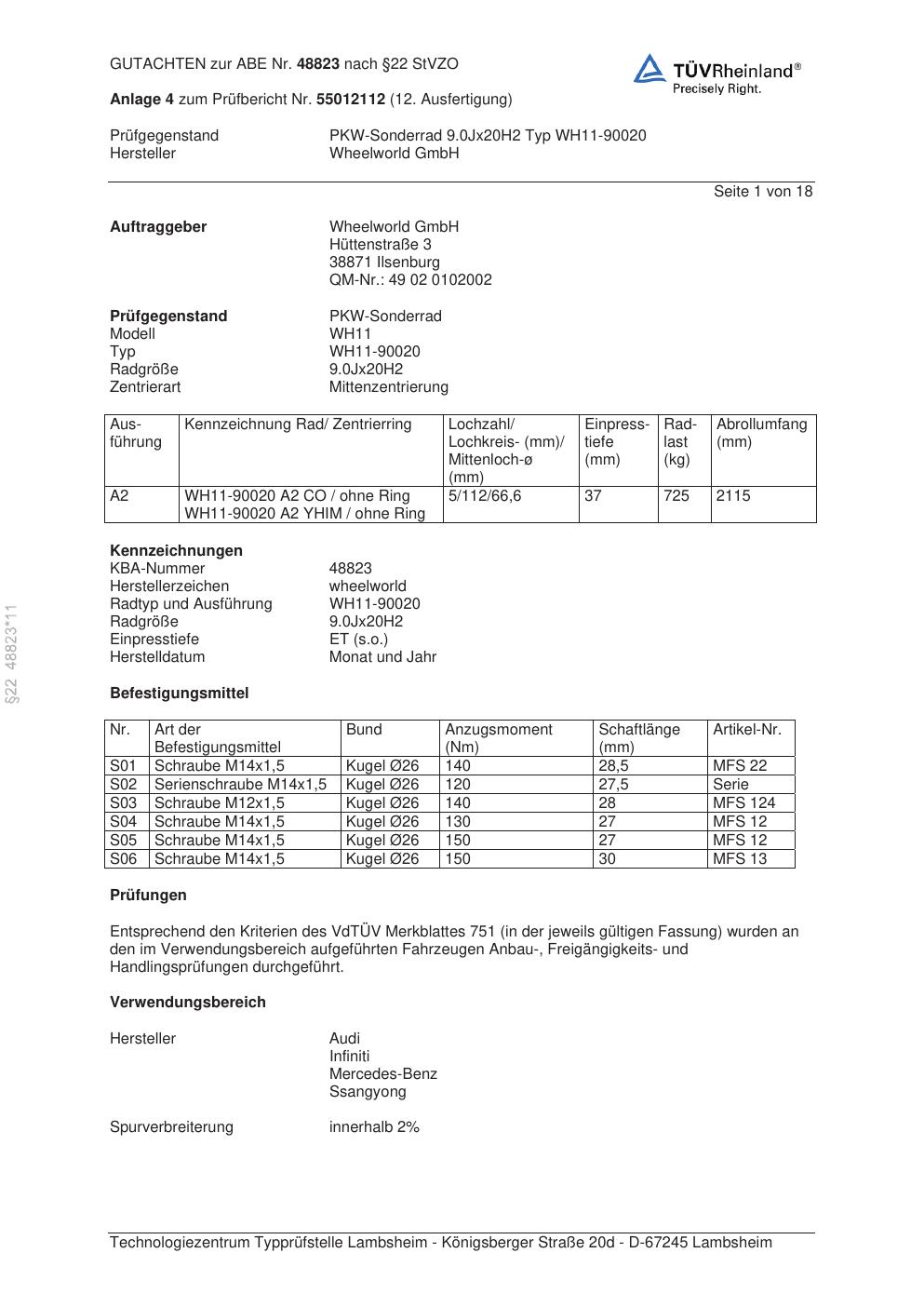 Dieses Gutachten (abe) bezieht sich auf die Alufelge Wheelworld WH11-90020 in der Ausführung ET 0, Mittenloch 0 mm (KBA 48823). Im PDF findest du typischerweise zulässige Reifengrößen, Auflagen/Anbauhinweise und – je nach Dokument – Hinweise zur Eintragung.