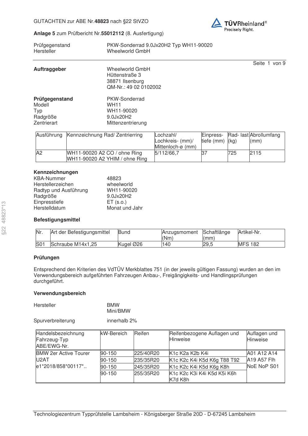 Dieses Gutachten (abe) bezieht sich auf die Alufelge Wheelworld WH11-90020 in der Ausführung ET 0, Mittenloch 0 mm (KBA 48823). Im PDF findest du typischerweise zulässige Reifengrößen, Auflagen/Anbauhinweise und – je nach Dokument – Hinweise zur Eintragung.