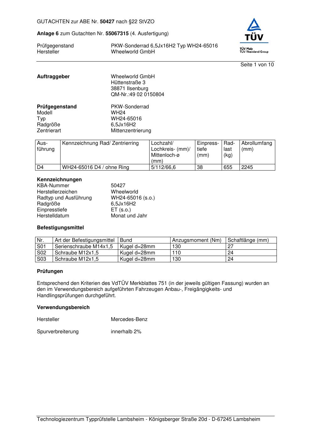 Dieses Gutachten (abe) bezieht sich auf die Alufelge Wheelworld GmbH WH24-650 16 in der Ausführung ET 0, Mittenloch 0 mm (KBA 50427). Im PDF findest du typischerweise zulässige Reifengrößen, Auflagen/Anbauhinweise und – je nach Dokument – Hinweise zur Eintragung.