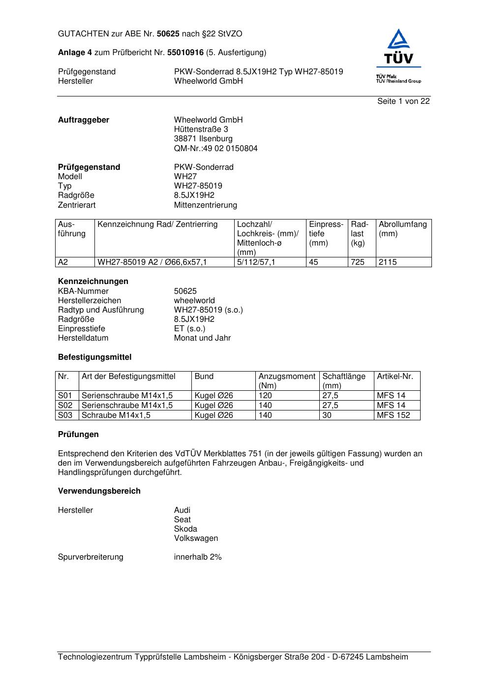 Dieses abe gehört zur Felge Wheelworld WH27-85019 in ET0 mit KBA 50625. Die Seite ist dafür gedacht, dass du schnell prüfen kannst, ob KBA, Design und Größe zu deiner Felge passen und danach direkt das richtige PDF lädst.