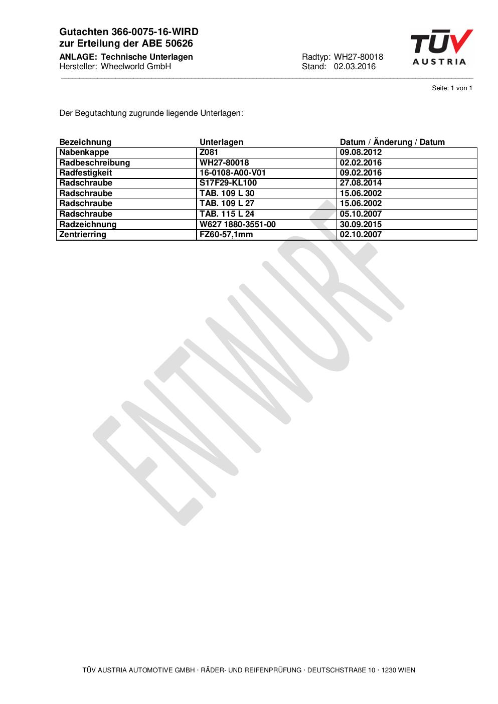 Dieses abe der Marke Wheelworld stammt vom jeweiligen Hersteller, Importeur oder einer Prüforganisation. Felgengutachten.de beansprucht hieran keine eigenen Urheber-, Nutzungs- oder sonstigen Schutzrechte. Soweit das Dokument urheber- oder leistungsschutzrechtlich geschützt ist, verbleiben die Rechte beim jeweiligen Rechteinhaber. Die Bereitstellung erfolgt ausschließlich zu Informationszwecken für Endnutzer, z. B. zur Vorlage bei Prüfstellen oder zur eigenen Fahrzeugdokumentation.