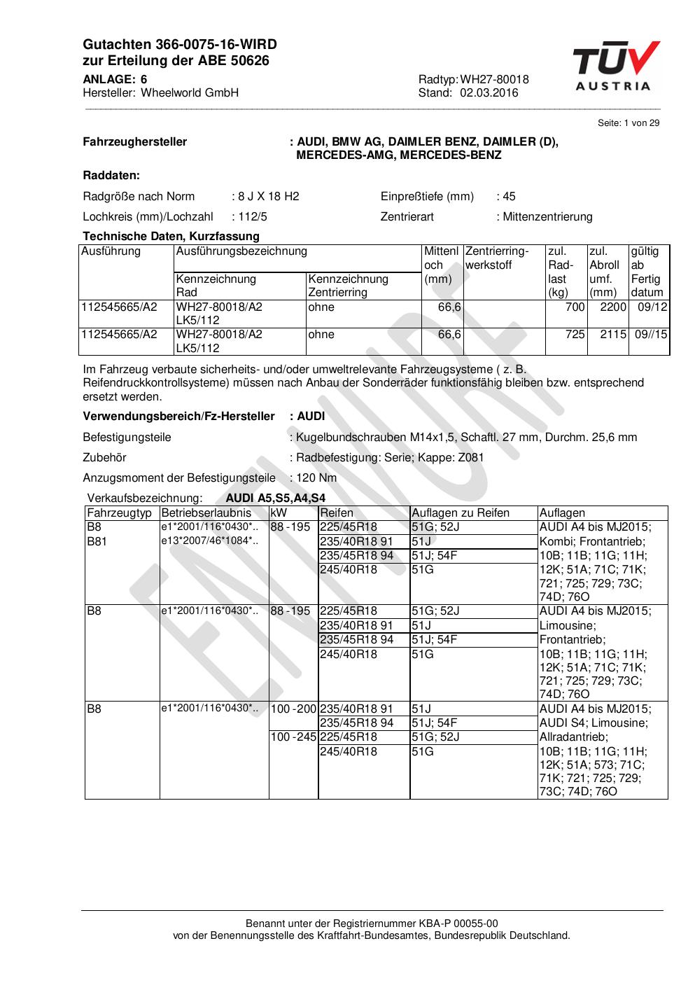 • Stimmt die KBA-Nummer auf der Felge mit diesem Dokument überein?