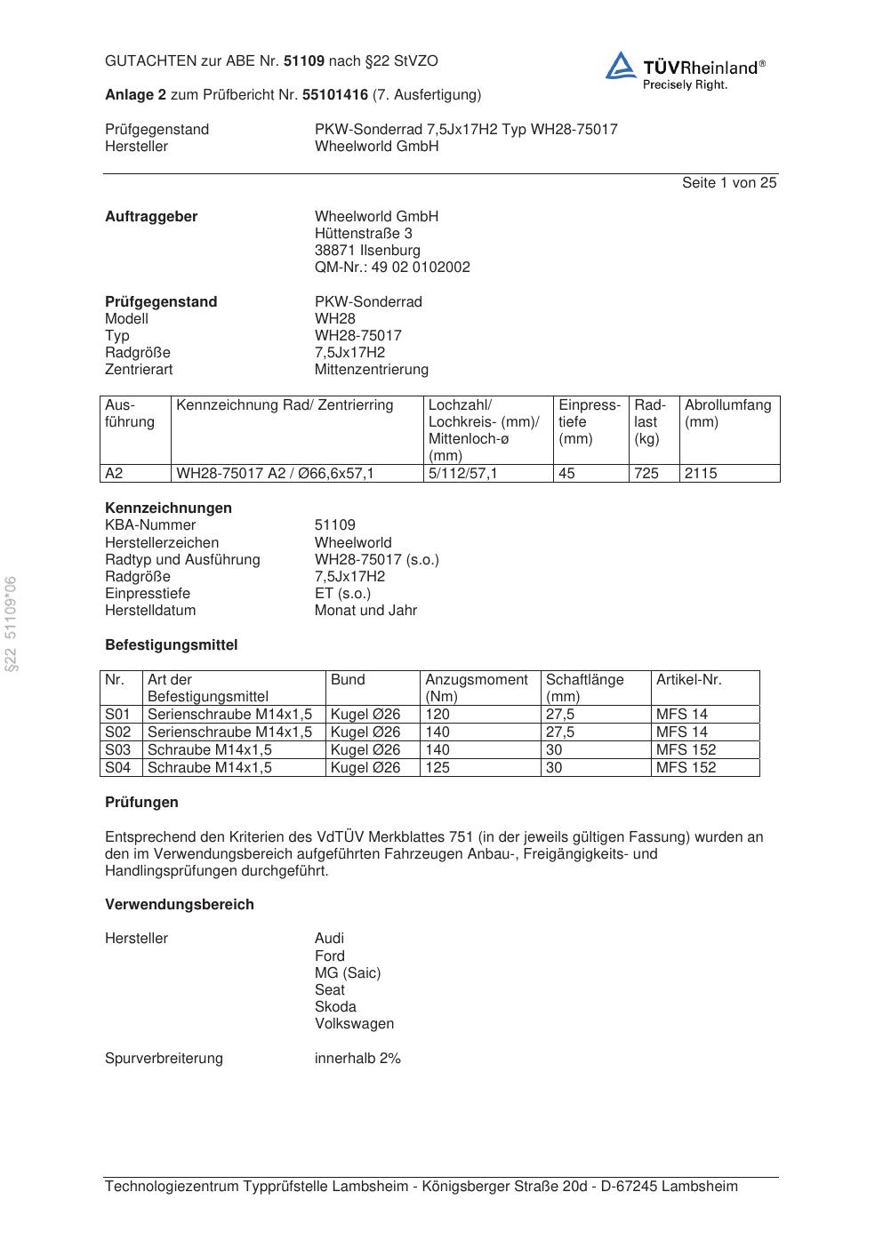 Dieses Gutachten (abe) bezieht sich auf die Alufelge Wheelworld WH28-75017 in der Ausführung ET 0, Mittenloch 0 mm (KBA 51109). Im PDF findest du typischerweise zulässige Reifengrößen, Auflagen/Anbauhinweise und – je nach Dokument – Hinweise zur Eintragung.