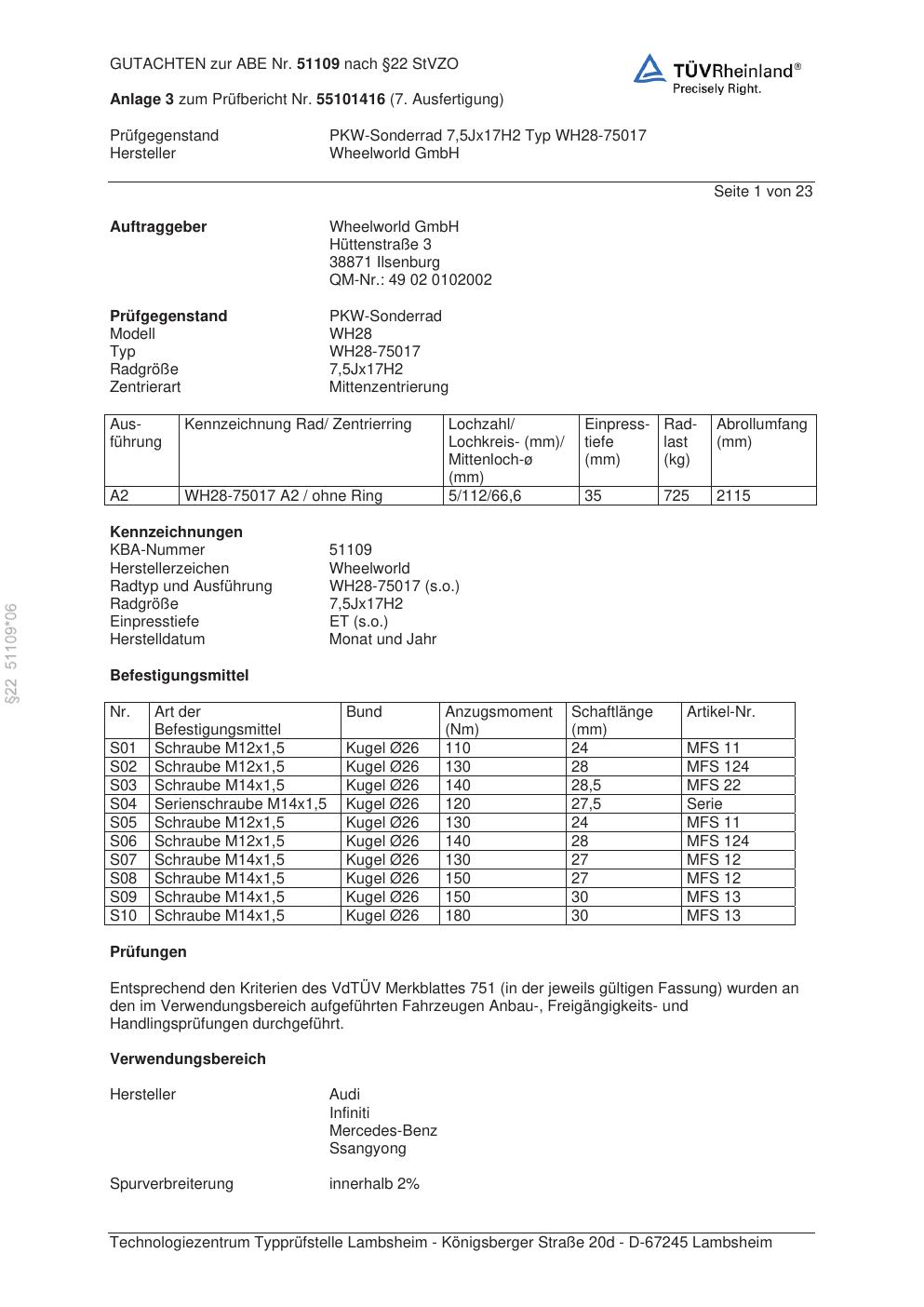 Dieses Gutachten (abe) bezieht sich auf die Alufelge Wheelworld WH28-75017 in der Ausführung ET 0, Mittenloch 0 mm (KBA 51109). Im PDF findest du typischerweise zulässige Reifengrößen, Auflagen/Anbauhinweise und – je nach Dokument – Hinweise zur Eintragung.