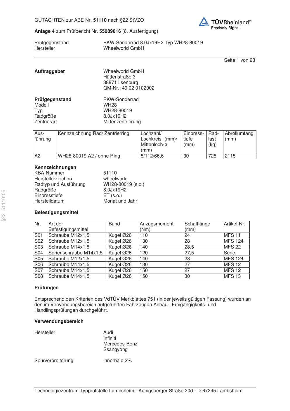 Dieses Gutachten (abe) bezieht sich auf die Alufelge Wheelworld WH28-80019 in der Ausführung ET 0, Mittenloch 0 mm (KBA 51110). Im PDF findest du typischerweise zulässige Reifengrößen, Auflagen/Anbauhinweise und – je nach Dokument – Hinweise zur Eintragung.