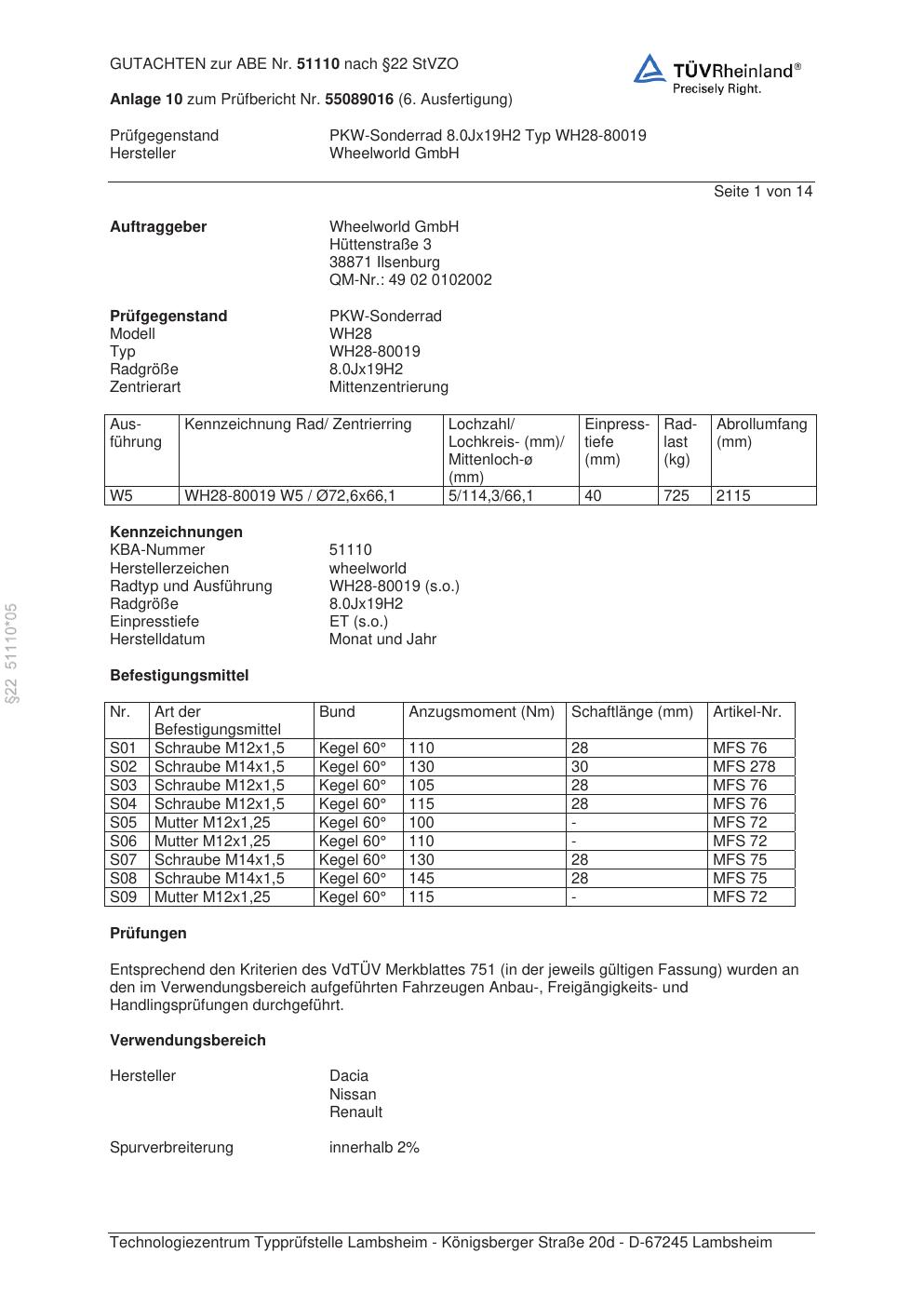 Dieses Gutachten (abe) bezieht sich auf die Alufelge Wheelworld WH28-80019 in der Ausführung ET 0, Mittenloch 0 mm (KBA 51110). Im PDF findest du typischerweise zulässige Reifengrößen, Auflagen/Anbauhinweise und – je nach Dokument – Hinweise zur Eintragung.