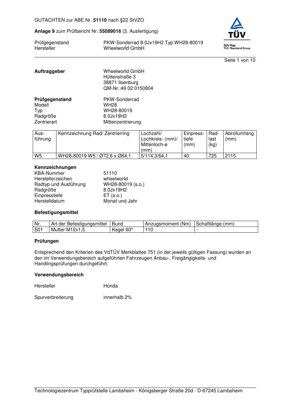 Dieses Gutachten (abe) bezieht sich auf die Alufelge Wheelworld WH28-80019 in der Ausführung ET 0, Mittenloch 0 mm (KBA 51110). Im PDF findest du typischerweise zulässige Reifengrößen, Auflagen/Anbauhinweise und – je nach Dokument – Hinweise zur Eintragung.
