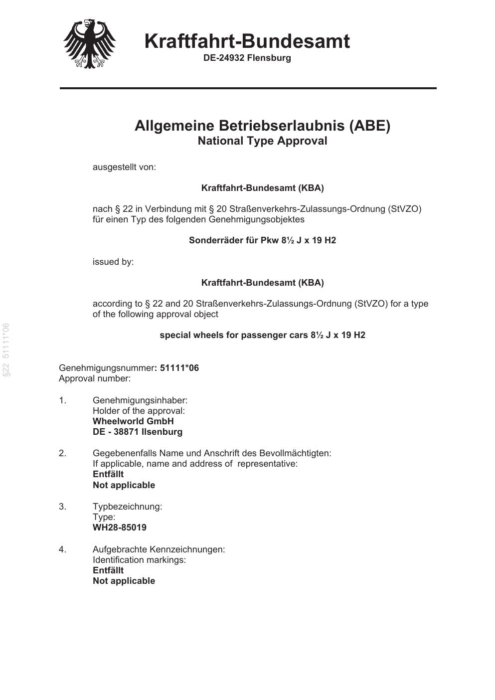 Dieses abe gehört zur Felge Wheelworld WH28-85019 in ET0 mit KBA 51111. Die Seite ist dafür gedacht, dass du schnell prüfen kannst, ob KBA, Design und Größe zu deiner Felge passen und danach direkt das richtige PDF lädst.