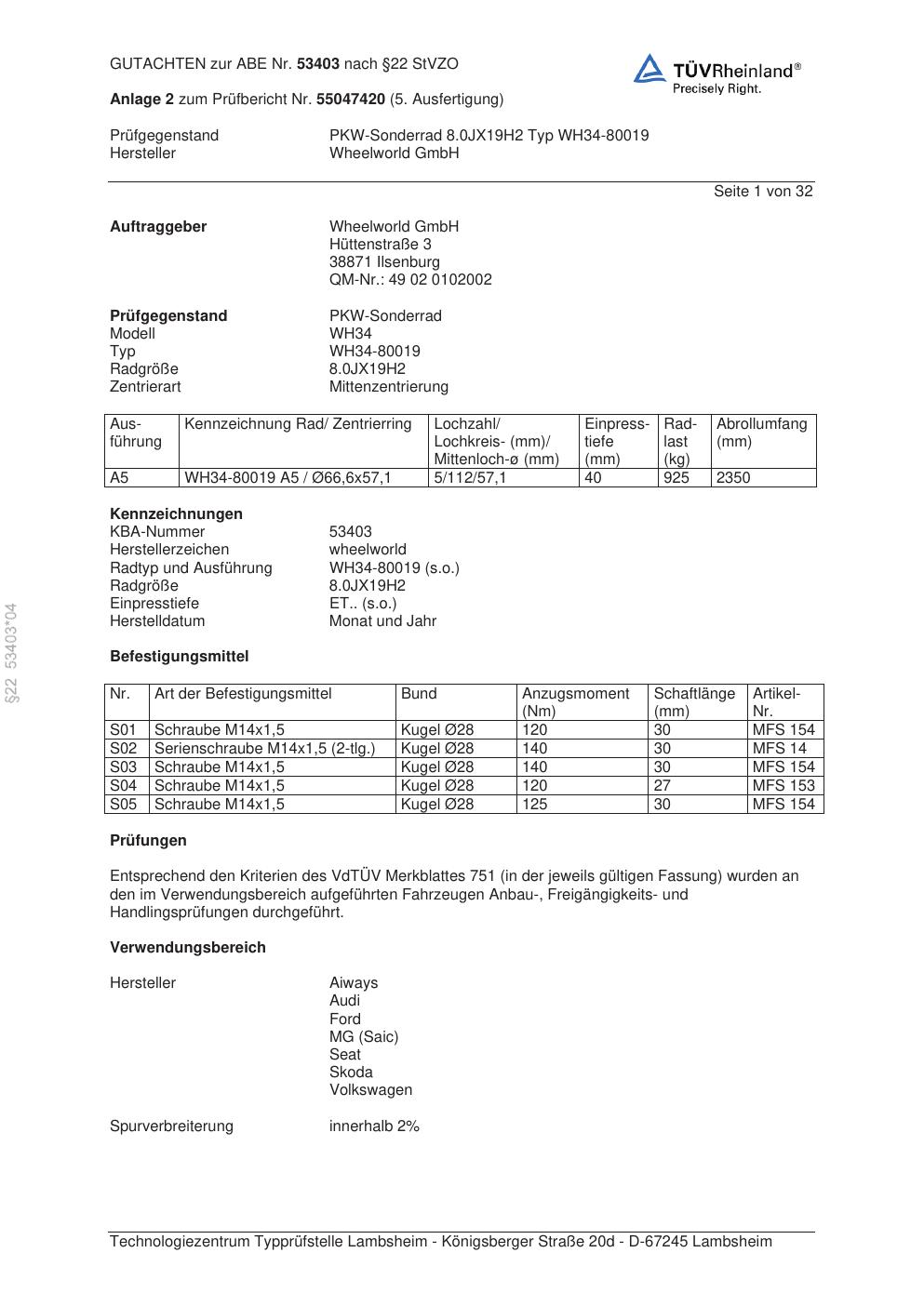 • Stimmt die KBA-Nummer auf der Felge mit diesem Dokument überein?
