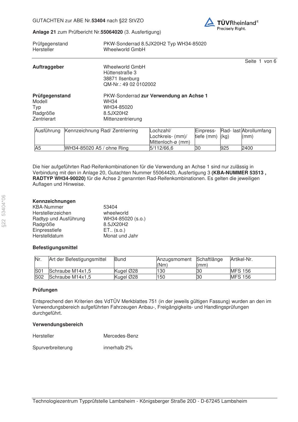 Dieses Gutachten (abe) bezieht sich auf die Alufelge Wheelworld GmbH WH34-85020 in der Ausführung ET 0, Mittenloch 0 mm (KBA 53404). Im PDF findest du typischerweise zulässige Reifengrößen, Auflagen/Anbauhinweise und – je nach Dokument – Hinweise zur Eintragung.