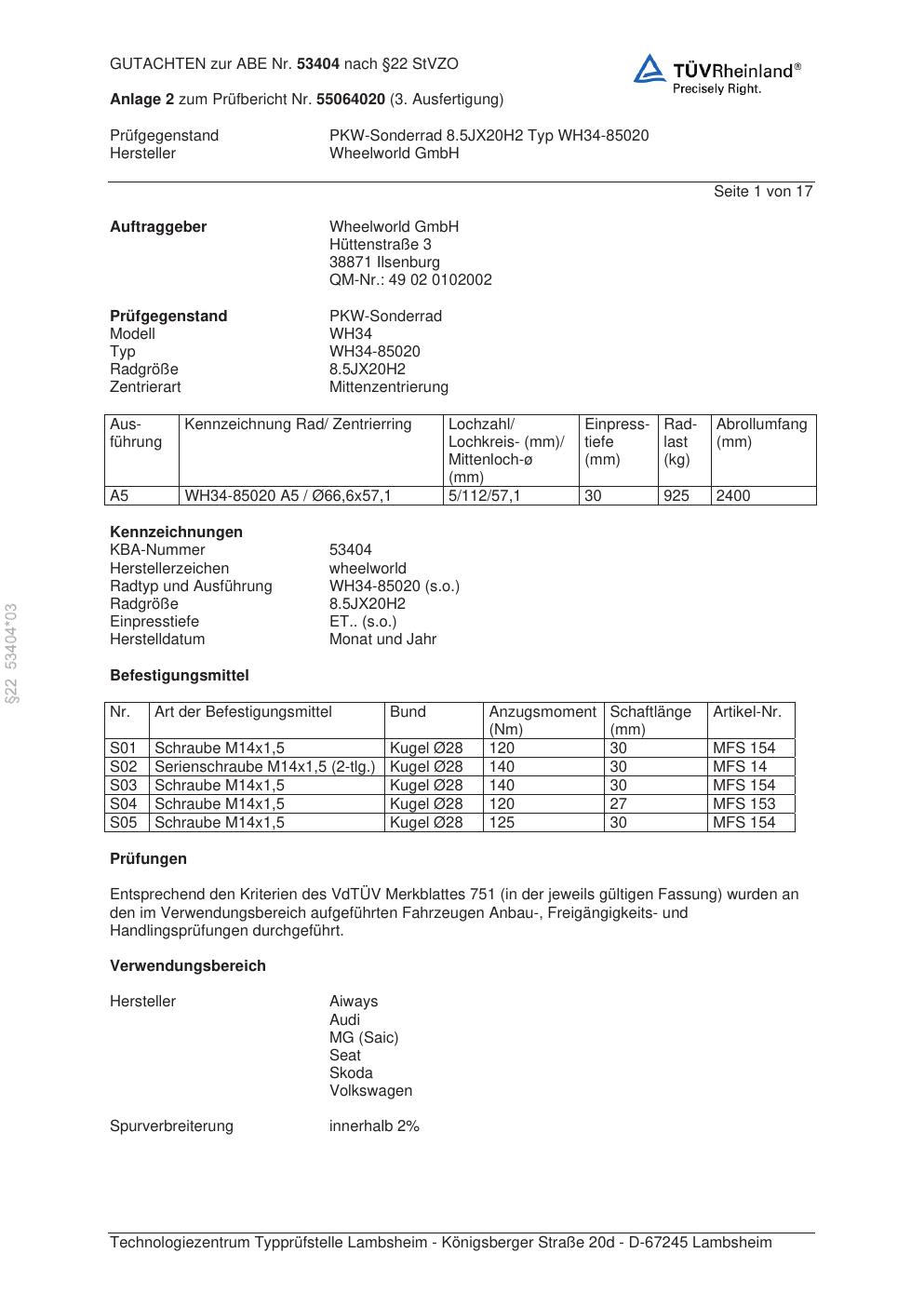 Dieses Gutachten (abe) bezieht sich auf die Alufelge Wheelworld GmbH WH34-85020 in der Ausführung ET 0, Mittenloch 0 mm (KBA 53404). Im PDF findest du typischerweise zulässige Reifengrößen, Auflagen/Anbauhinweise und – je nach Dokument – Hinweise zur Eintragung.
