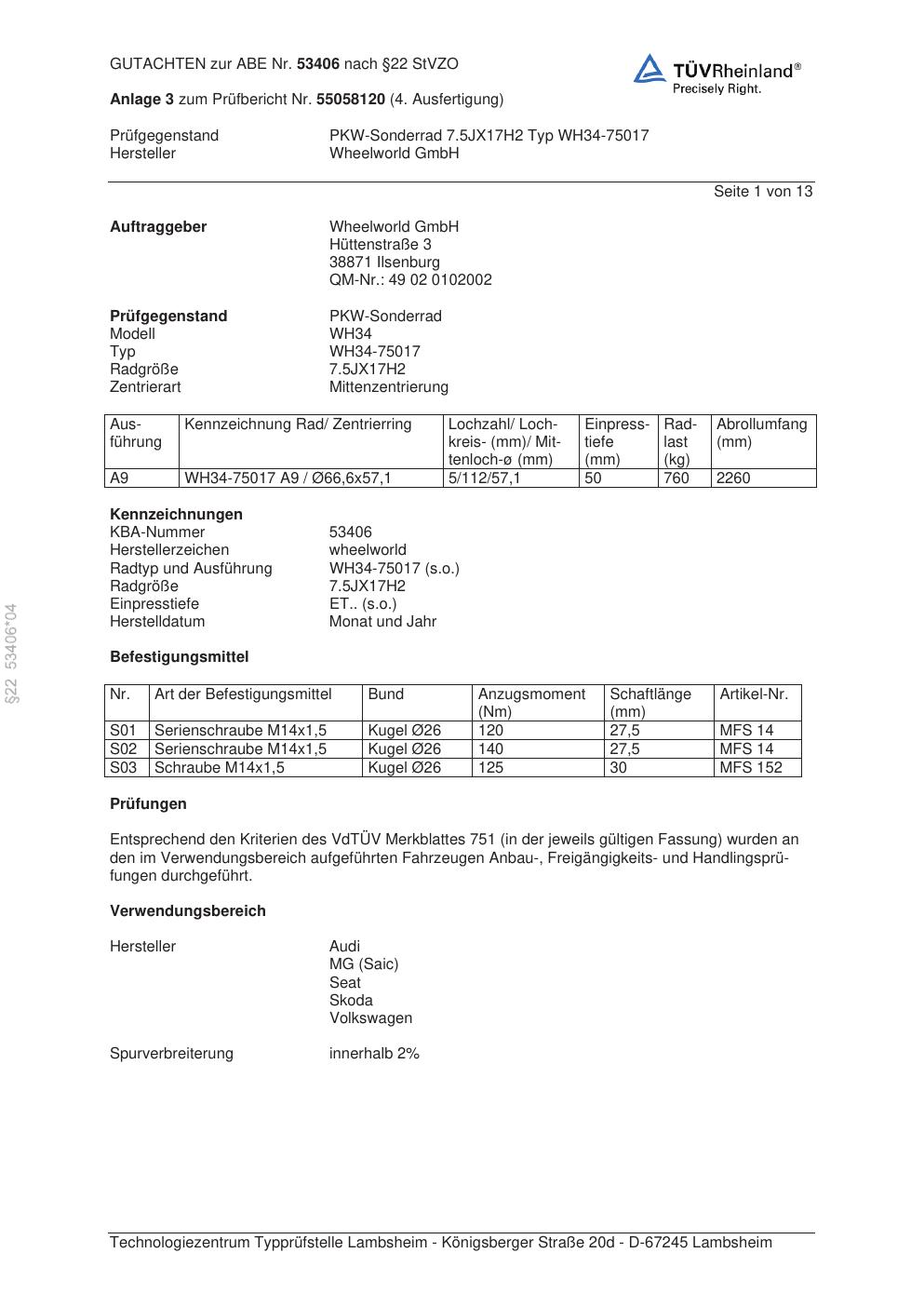 • Stimmt die KBA-Nummer auf der Felge mit diesem Dokument überein?