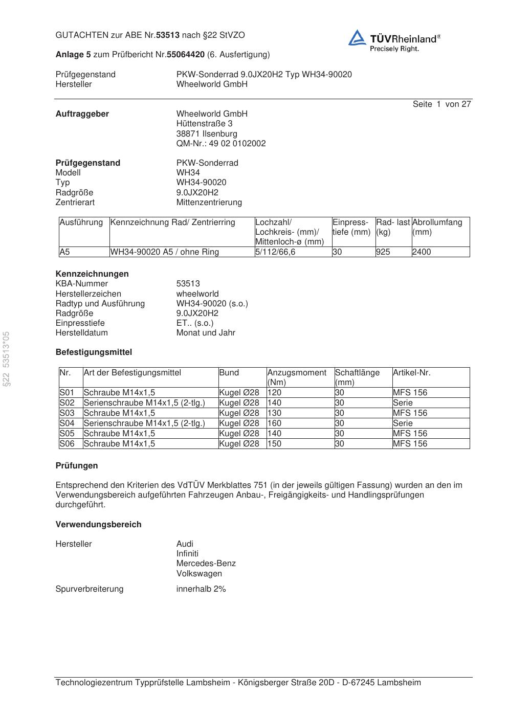 Dieses Gutachten (abe) bezieht sich auf die Alufelge Wheelworld WH34-90020 in der Ausführung ET 0, Mittenloch 0 mm (KBA 53513). Im PDF findest du typischerweise zulässige Reifengrößen, Auflagen/Anbauhinweise und – je nach Dokument – Hinweise zur Eintragung.
