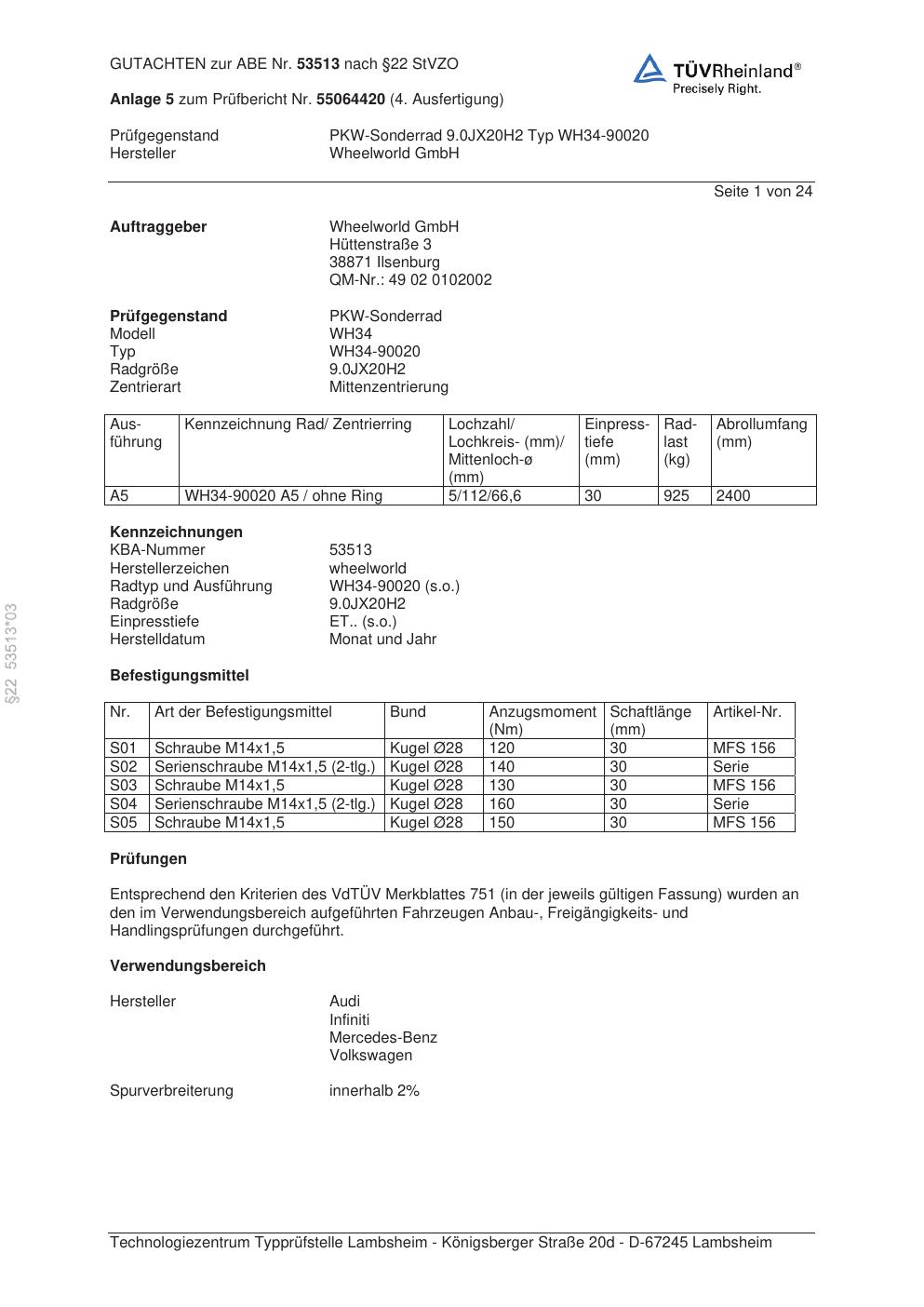 Dieses Gutachten (abe) bezieht sich auf die Alufelge Wheelworld WH34-90020 in der Ausführung ET 0, Mittenloch 0 mm (KBA 53513). Im PDF findest du typischerweise zulässige Reifengrößen, Auflagen/Anbauhinweise und – je nach Dokument – Hinweise zur Eintragung.
