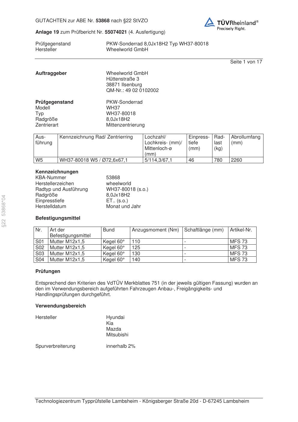 Dieses Gutachten (abe) bezieht sich auf die Alufelge Wheelworld WH37-80018 in der Ausführung ET 0, Mittenloch 0 mm (KBA 53868). Im PDF findest du typischerweise zulässige Reifengrößen, Auflagen/Anbauhinweise und – je nach Dokument – Hinweise zur Eintragung.
