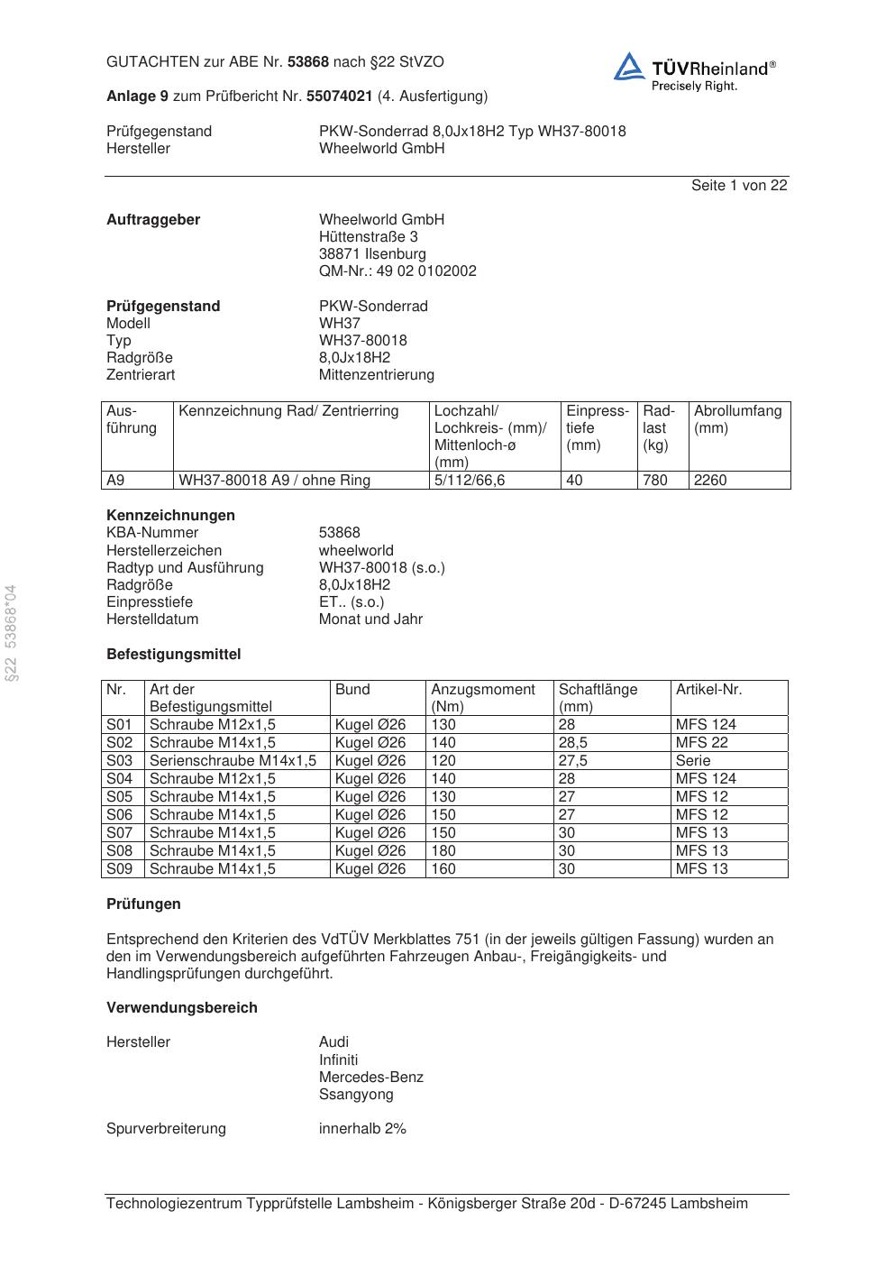 Dieses Gutachten (abe) bezieht sich auf die Alufelge Wheelworld WH37-80018 in der Ausführung ET 0, Mittenloch 0 mm (KBA 53868). Im PDF findest du typischerweise zulässige Reifengrößen, Auflagen/Anbauhinweise und – je nach Dokument – Hinweise zur Eintragung.