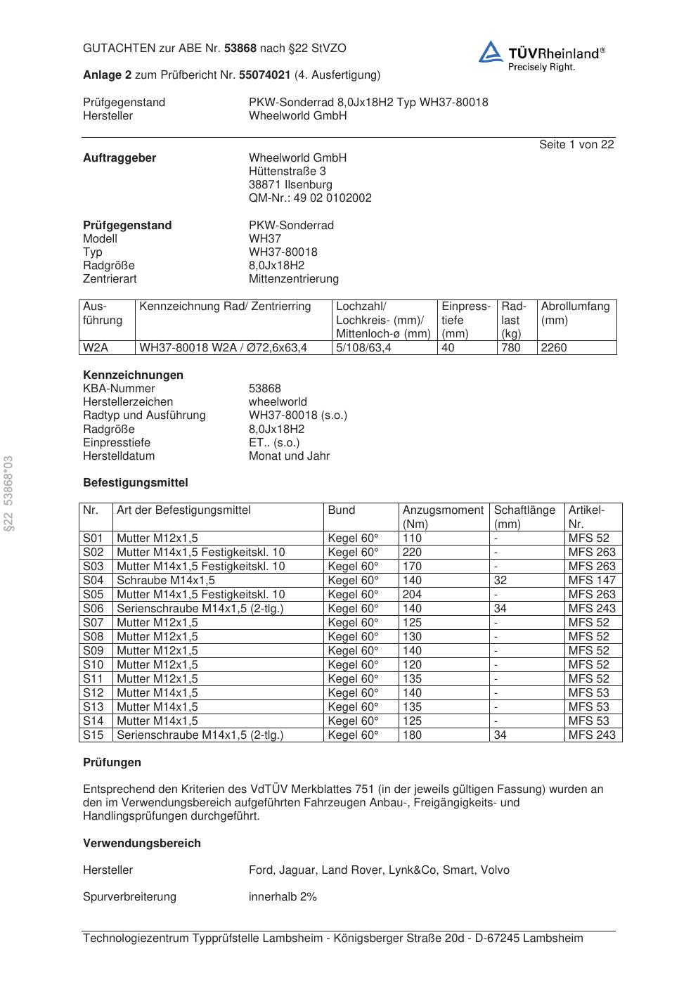 Dieses Gutachten (abe) bezieht sich auf die Alufelge Wheelworld WH37-80018 in der Ausführung ET 0, Mittenloch 0 mm (KBA 53868). Im PDF findest du typischerweise zulässige Reifengrößen, Auflagen/Anbauhinweise und – je nach Dokument – Hinweise zur Eintragung.