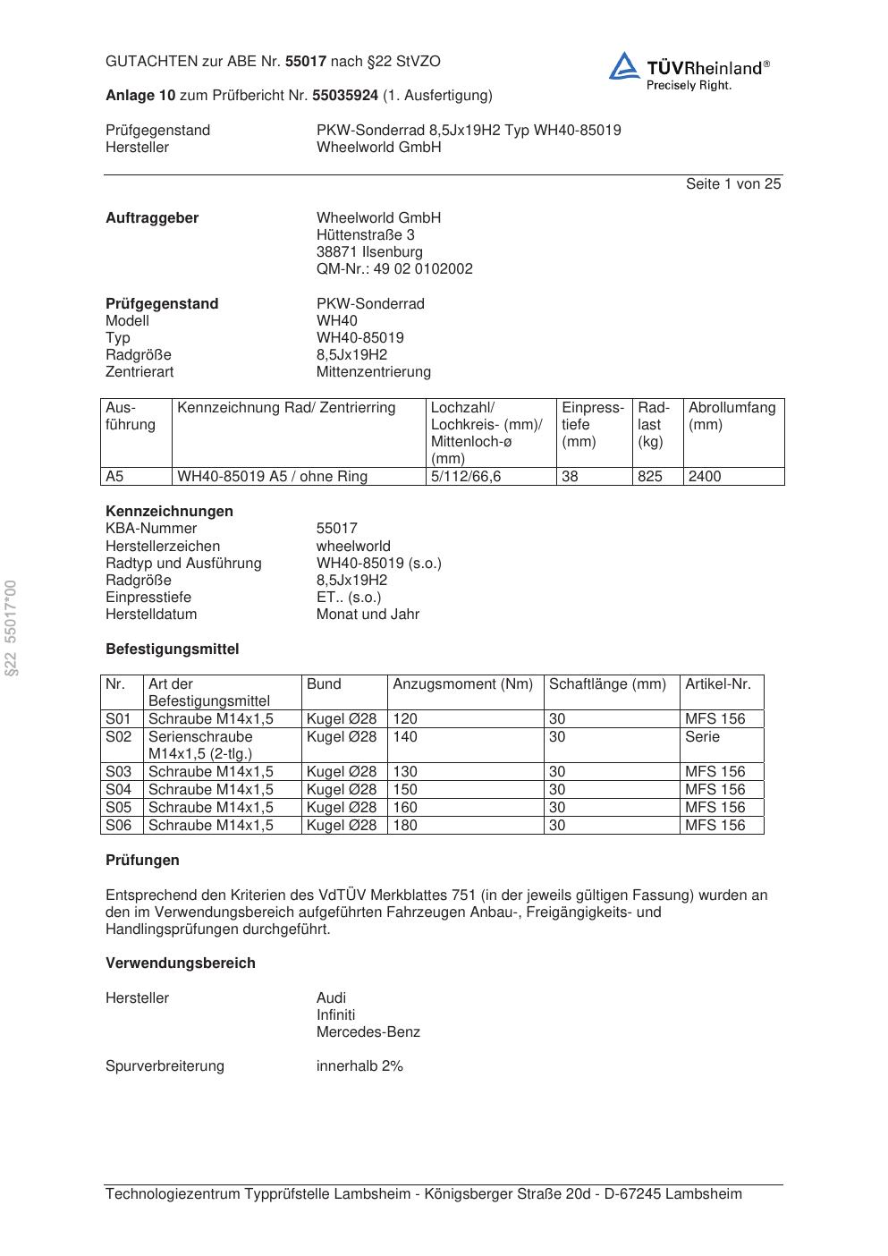 Dieses Gutachten (abe) bezieht sich auf die Alufelge Wheelworld GmbH WH40-85019 in der Ausführung ET 0, Mittenloch 0 mm (KBA 55017). Im PDF findest du typischerweise zulässige Reifengrößen, Auflagen/Anbauhinweise und – je nach Dokument – Hinweise zur Eintragung.