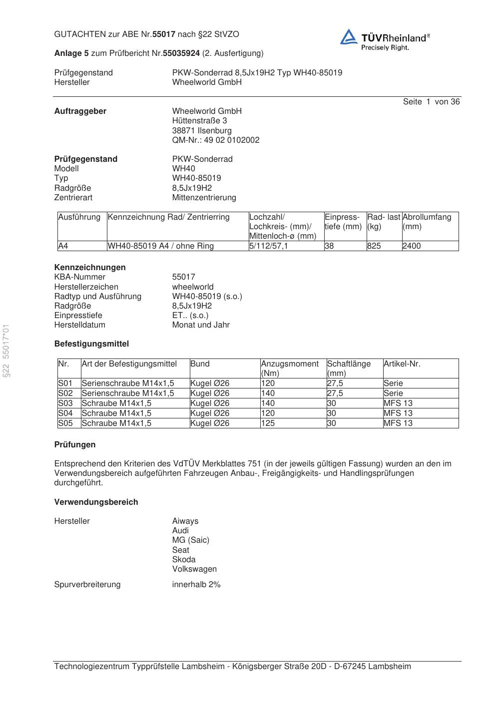 Dieses Gutachten (abe) bezieht sich auf die Alufelge Wheelworld GmbH WH40-85019 in der Ausführung ET 0, Mittenloch 0 mm (KBA 55017). Im PDF findest du typischerweise zulässige Reifengrößen, Auflagen/Anbauhinweise und – je nach Dokument – Hinweise zur Eintragung.
