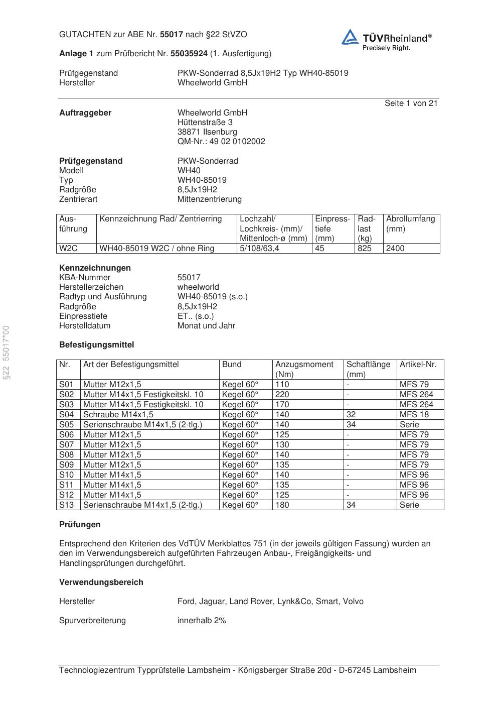 Dieses Gutachten (abe) bezieht sich auf die Alufelge Wheelworld GmbH WH40-85019 in der Ausführung ET 0, Mittenloch 0 mm (KBA 55017). Im PDF findest du typischerweise zulässige Reifengrößen, Auflagen/Anbauhinweise und – je nach Dokument – Hinweise zur Eintragung.