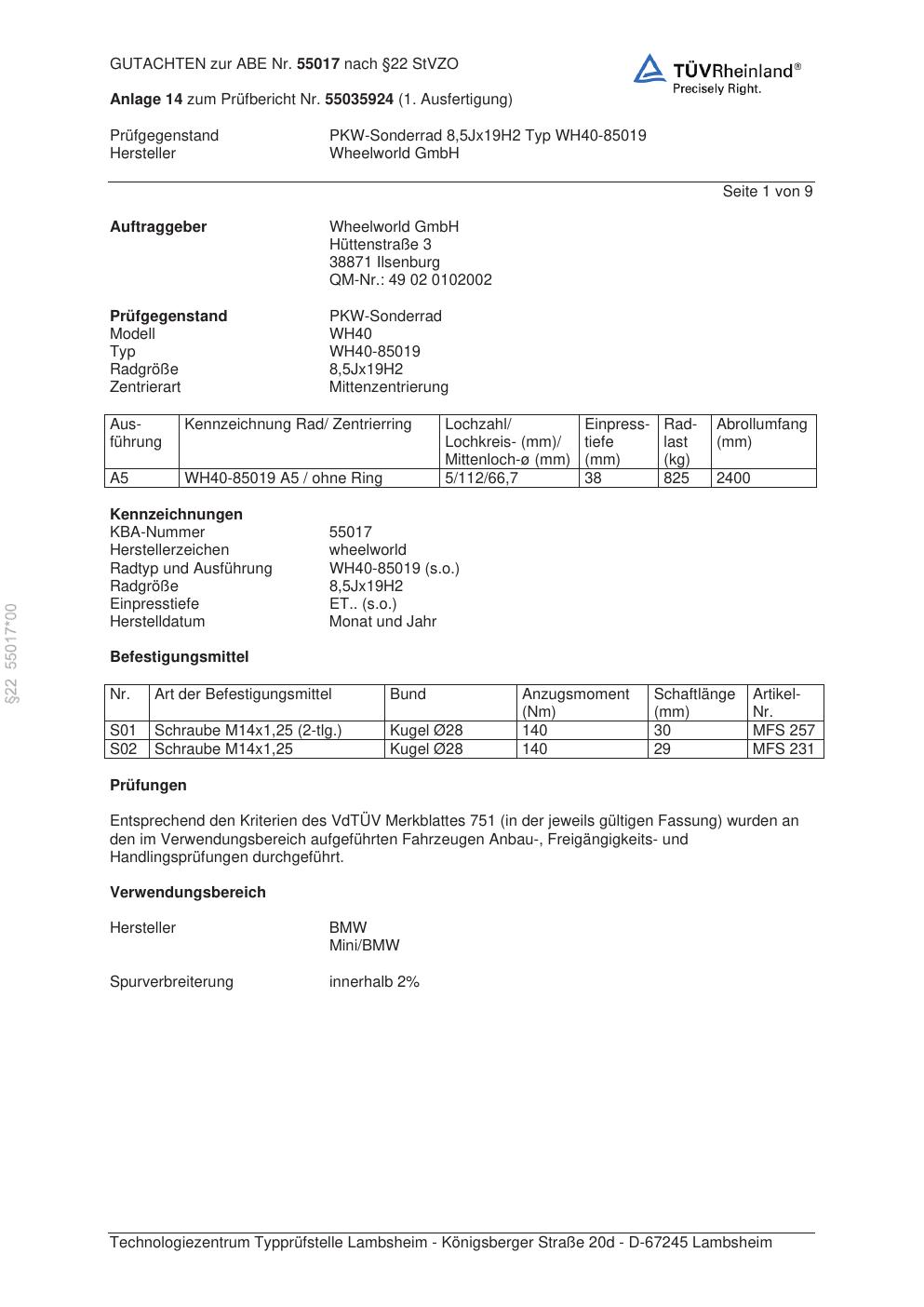 Dieses Gutachten (abe) bezieht sich auf die Alufelge Wheelworld GmbH WH40-85019 in der Ausführung ET 0, Mittenloch 0 mm (KBA 55017). Im PDF findest du typischerweise zulässige Reifengrößen, Auflagen/Anbauhinweise und – je nach Dokument – Hinweise zur Eintragung.