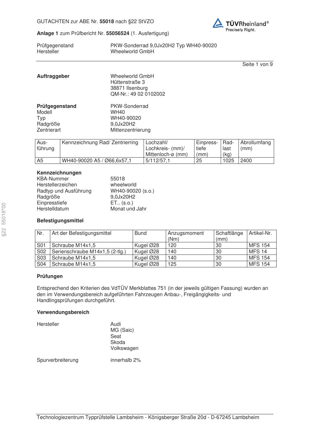 Dieses Gutachten (abe) bezieht sich auf die Alufelge Wheelworld WH40-90020 in der Ausführung ET 0, Mittenloch 0 mm (KBA 55018). Im PDF findest du typischerweise zulässige Reifengrößen, Auflagen/Anbauhinweise und – je nach Dokument – Hinweise zur Eintragung.