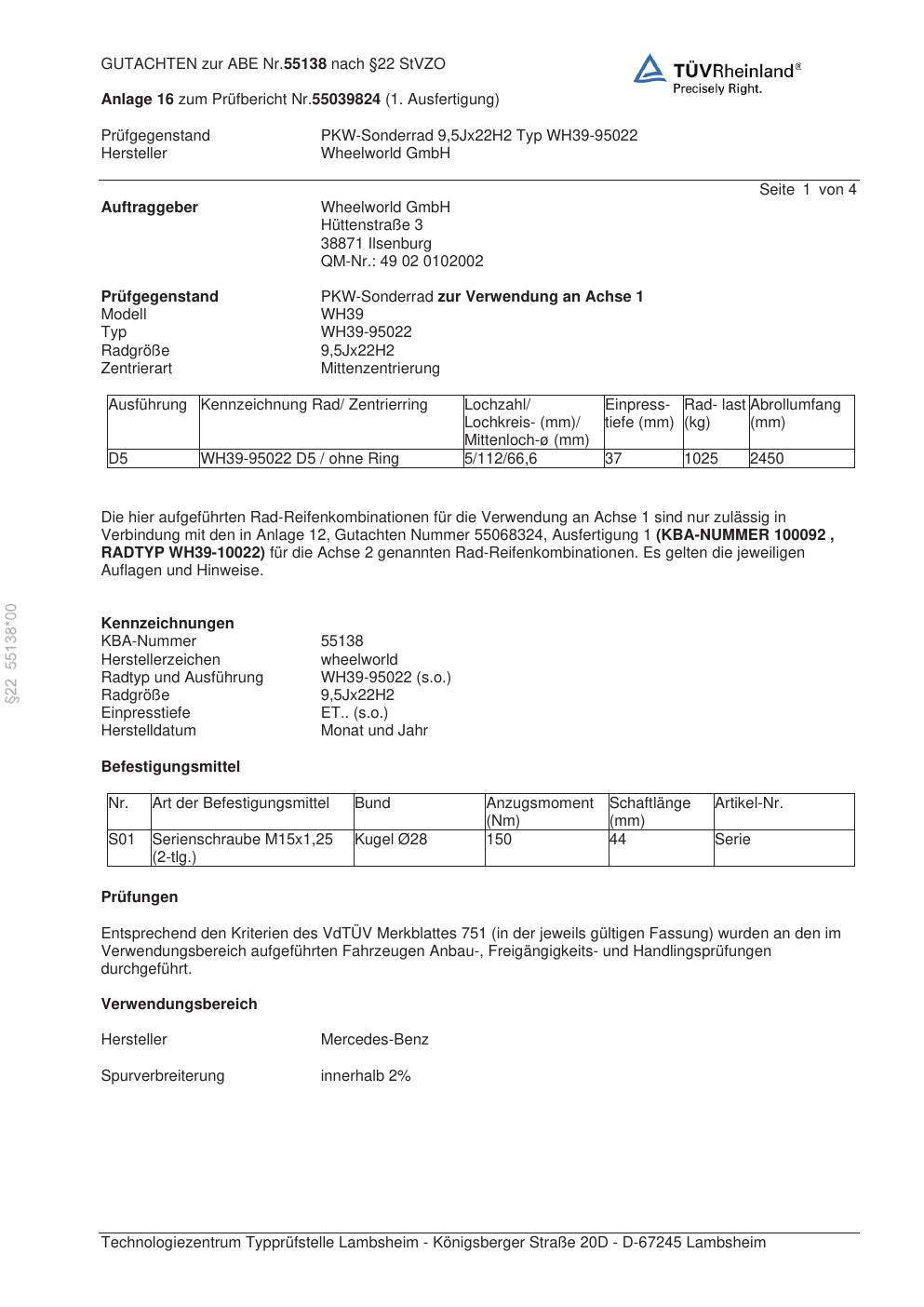 Dieses Gutachten (abe) bezieht sich auf die Alufelge Wheelworld GmbH WH39-95022 in der Ausführung ET 0, Mittenloch 0 mm (KBA 55138). Im PDF findest du typischerweise zulässige Reifengrößen, Auflagen/Anbauhinweise und – je nach Dokument – Hinweise zur Eintragung.