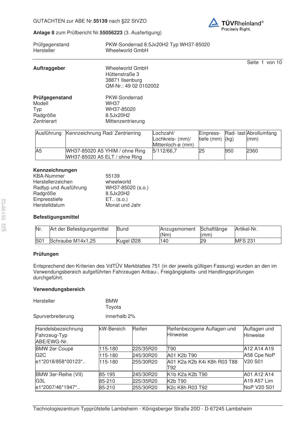 Dieses Gutachten (abe) bezieht sich auf die Alufelge Wheelworld GmbH WH37-85020 in der Ausführung ET 0, Mittenloch 0 mm (KBA 55139). Im PDF findest du typischerweise zulässige Reifengrößen, Auflagen/Anbauhinweise und – je nach Dokument – Hinweise zur Eintragung.