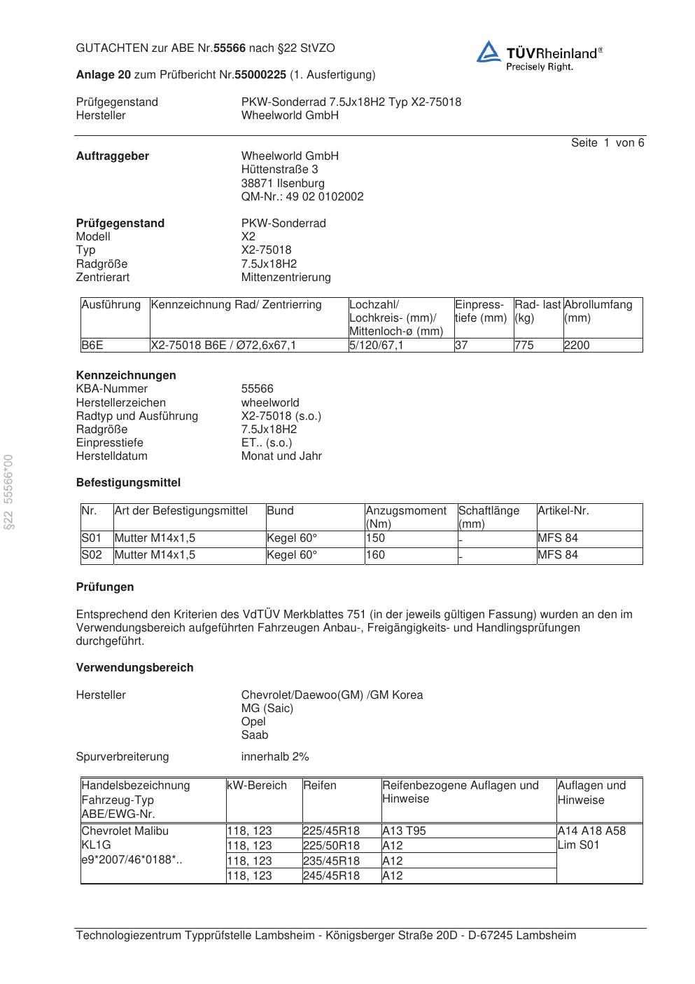 Dieses Gutachten (abe) bezieht sich auf die Alufelge Wheelworld X2-75018 in der Ausführung ET 0, Mittenloch 0 mm (KBA 55566). Im PDF findest du typischerweise zulässige Reifengrößen, Auflagen/Anbauhinweise und – je nach Dokument – Hinweise zur Eintragung.