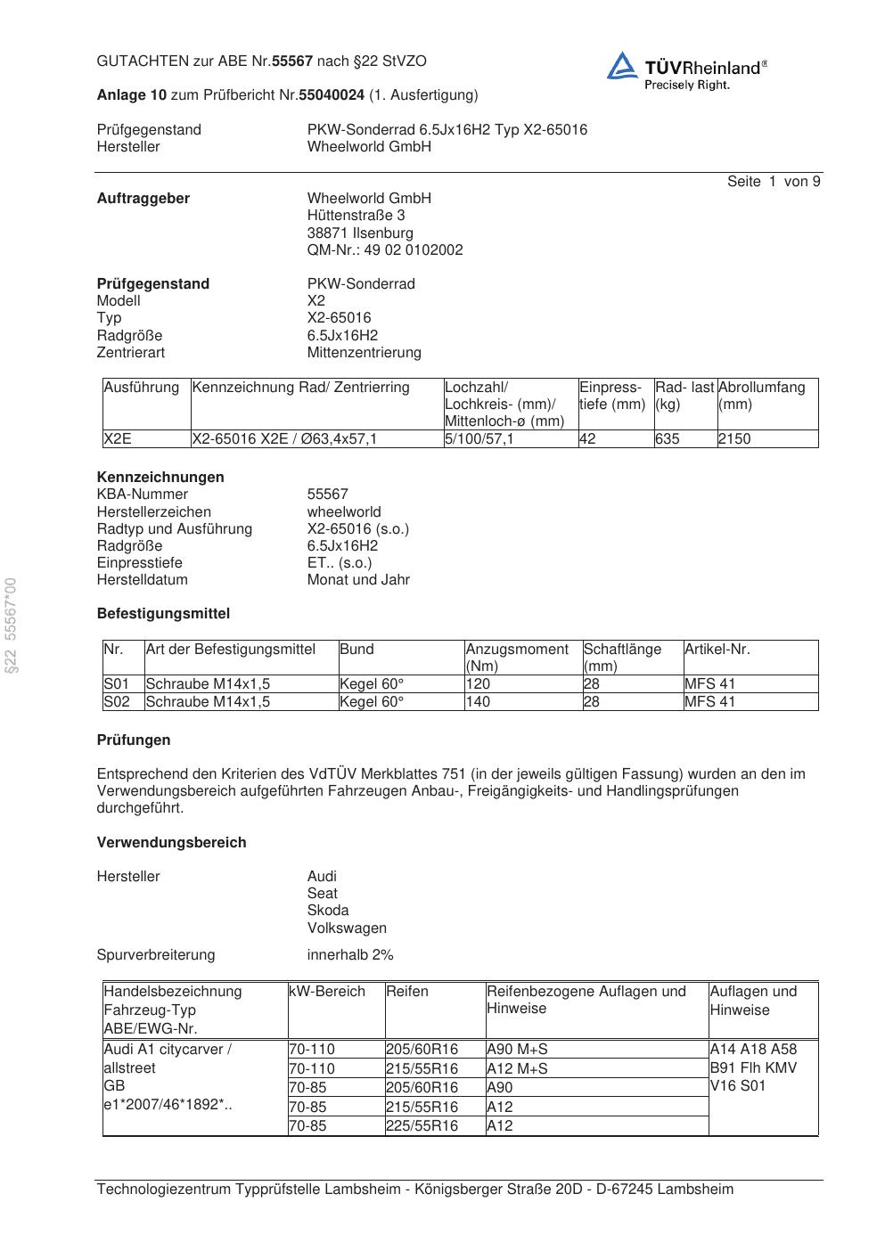 Dieses Gutachten (abe) bezieht sich auf die Alufelge Wheelworld X2-65016 in der Ausführung ET 0, Mittenloch 0 mm (KBA 55567). Im PDF findest du typischerweise zulässige Reifengrößen, Auflagen/Anbauhinweise und – je nach Dokument – Hinweise zur Eintragung.
