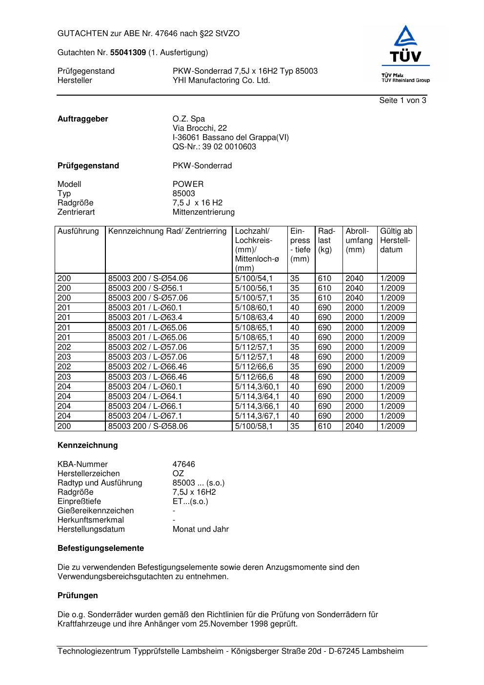Felgengutachten / abe für Alufelgen YHI Manufactoring Co. Ltd. 85003 (ET 0, Mittenloch 0 mm) mit KBA 47646 (Zertifikatsnummer 47646). Hier kostenlos als PDF herunterladen. Der Download-Link ist 24 Stunden gültig und kann bis zu zwei Mal verwendet werden.