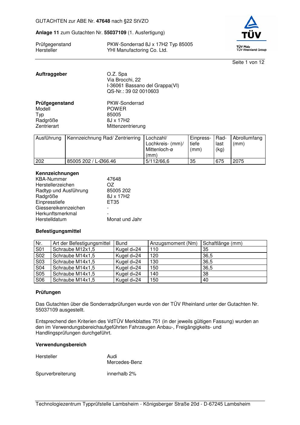 Dieses Gutachten (abe) bezieht sich auf die Alufelge YHI Manufactoring Co. Ltd. 85005 in der Ausführung ET 0, Mittenloch 0 mm (KBA 47648). Im PDF findest du typischerweise zulässige Reifengrößen, Auflagen/Anbauhinweise und – je nach Dokument – Hinweise zur Eintragung.