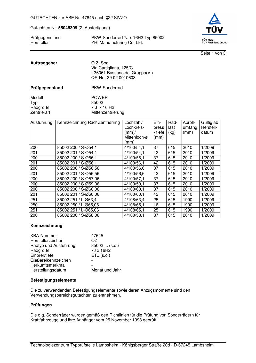 Felgengutachten / abe für Alufelgen YHI Manufacturing Co. Ltd. 85002 (ET 0, Mittenloch 0 mm) mit KBA 47645 (Zertifikatsnummer 47645). Hier kostenlos als PDF herunterladen. Der Download-Link ist 24 Stunden gültig und kann bis zu zwei Mal verwendet werden.